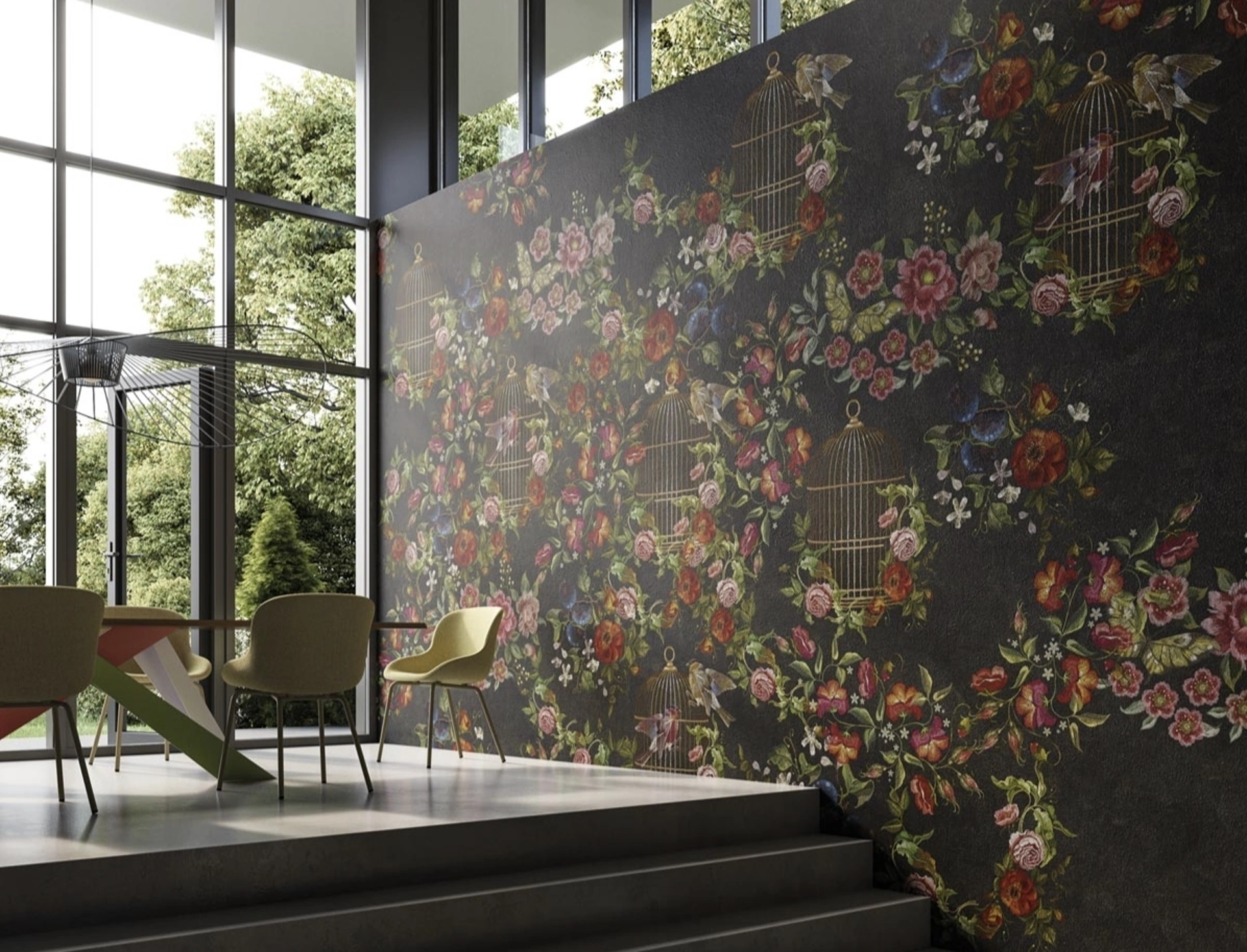 La carta da parati 'Cages' di Instabilelab si distingue per il suo peculiare design floreale nero, arricchito da intricate voliere dorate che generano un effetto visivo di profondo contrasto e raffinatezza. Questa composizione artistica fonde una base cromatica intensa con la dinamicità del motivo botanico, configurandosi come un elemento decorativo di notevole impatto. Le soluzioni grafiche di Instabilelab, tra cui 'Cages', sono compatibili con una pluralità di supporti tecnici, ideali per l'installazione in diverse tipologie di ambienti, quali aree living, zone notte, spazi bagno e contesti esterni. La gamma di materiali impiegabili include 'Prestige' (con stratificazione a base aurea), 'New Middle' (caratterizzato da una tessitura effetto lino), 'Cross' (che evoca la trama di un tessuto grezzo), 'Green' (formulazione ecologica priva di PVC, a base cellulosica) e 'Fibratex' (ottimizzato per ambienti ad alta umidità e applicazioni outdoor). Per approfondimenti sulle specifiche tecniche dei materiali e sulle opzioni di finitura, si prega di consultare la documentazione tecnica del prodotto.