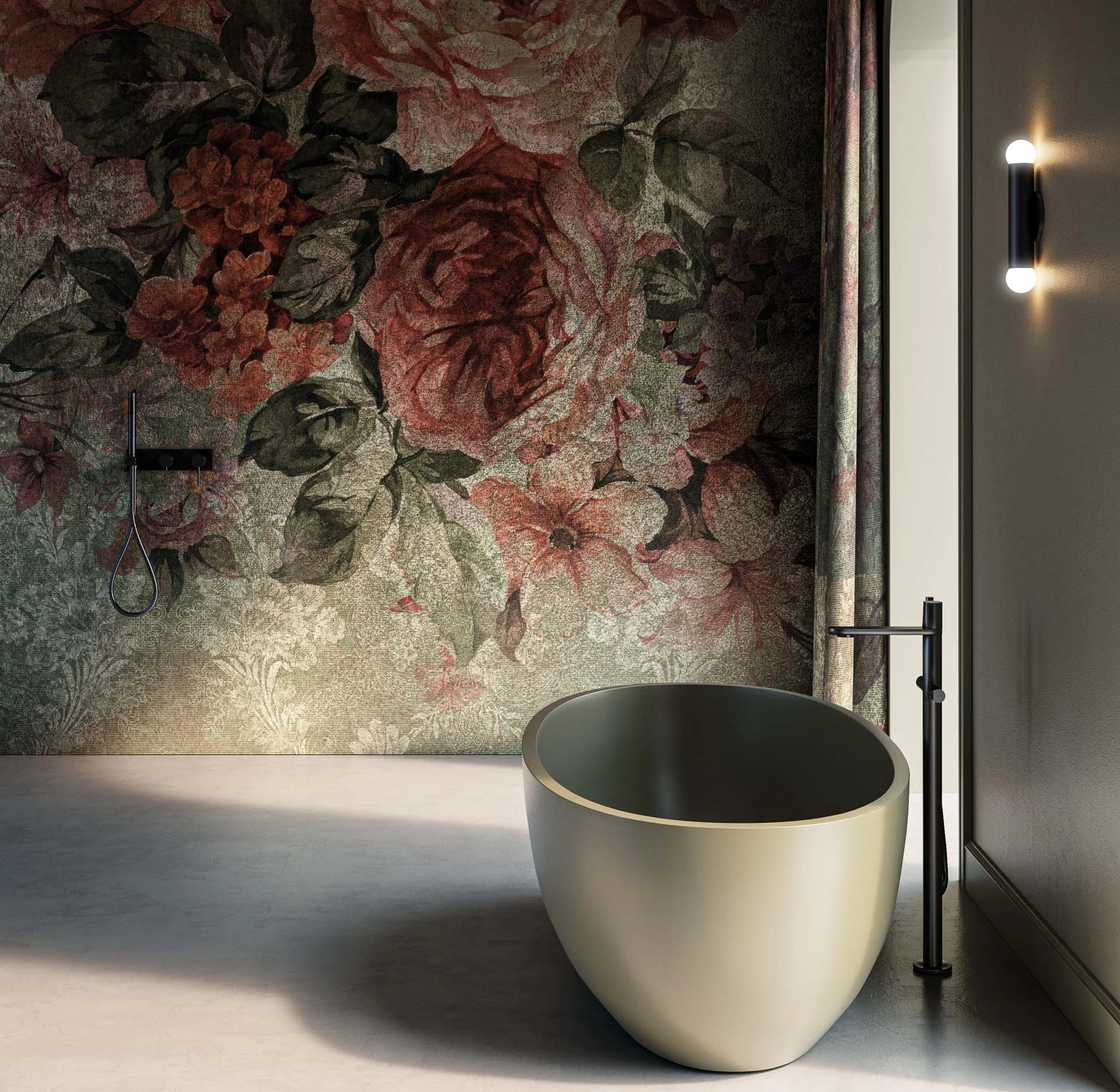 La carta da parati Pablo di Instabilelab si distingue per il suo design floreale di grande impatto, trasformando gli interni in ambienti di raffinata bellezza. Il motivo, che evoca rose e fogliame, è studiato per creare un'atmosfera distintiva e coinvolgente. Instabilelab propone un'ampia gamma di supporti tecnici per la stampa delle grafiche, adatti a diverse destinazioni d'uso come living, camere da letto, bagni e spazi esterni, garantendo versatilità progettuale. Fanno eccezione i supporti speciali come Prestige (base oro), dedicati a collezioni esclusive. Le opzioni di personalizzazione consentono di applicare le grafiche su materiali avanzati quali Moketa, Moquette, Sonora, Cross, Fibratex, Green, New Middle, Velluto, ognuno con specifiche proprietà tecniche. Questa soluzione d'arredo, frutto di ricerca e innovazione, si distingue per la sua capacità di integrare estetica e prestazioni, offrendo un'esperienza visiva e tattile superiore.