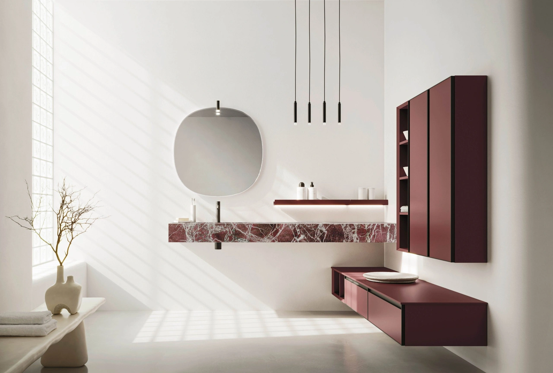 La composizione d'arredo bagno Absolute 46, firmata Arbi, incarna l'eccellenza del design funzionale. Questa configurazione si distingue per il piano top da 16 cm in pregiato marmo Rosso Lepanto opaco, che si abbina perfettamente al lavabo sottopiano rettangolare Igloo da 60 cm, realizzato in robusto materiale Tekno. Il miscelatore Geko, con la sua finitura nera, conferisce un tocco di modernità ed eleganza. La versatilità del sistema è arricchita da una mensola Tape da 105 cm in finitura Rosso Casale e da una specchiera Almond di 85x85 cm, illuminata da un faretto Ellipse nero. Componenti come l'elemento Regolo da 50x24,5 cm e le basi Absolute, con una larghezza complessiva di 140 cm (ottenuta da due moduli da 70 cm) e un'altezza di 24,5 cm, offrono soluzioni modulari per ottimizzare lo spazio. Per una comprensione approfondita delle specifiche tecniche e delle opzioni di finitura, è possibile consultare la documentazione di prodotto.