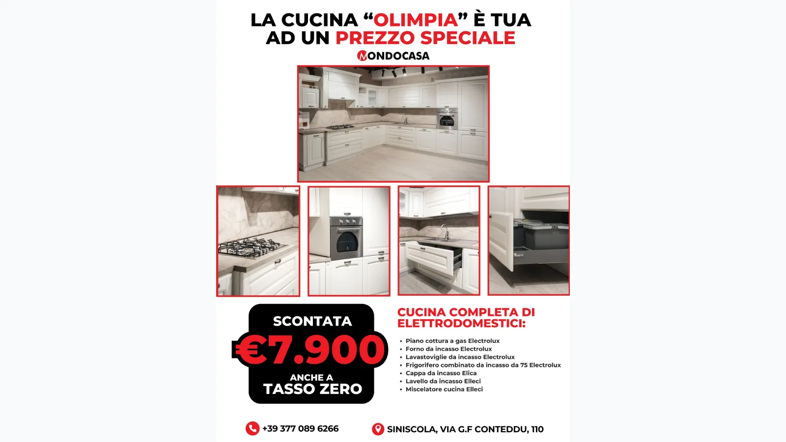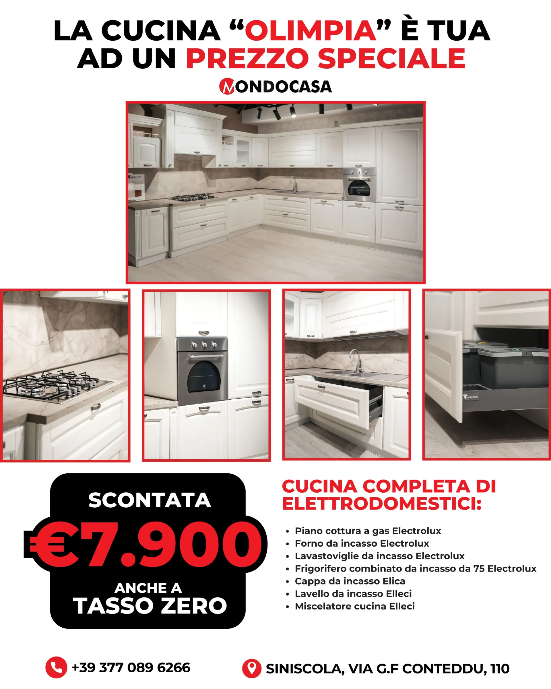 La cucina Olimpia è una composizione completa proposta a prezzo scontato, che unisce funzionalità, qualità degli elettrodomestici e praticità d’uso quotidiano.